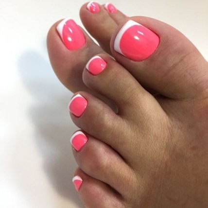 Френч-педикюр, выполненный в розовых оттенках, прекрасно дополняется белым или молочным цветом и удивительно нежно, красиво украшает ногтевые пластины.