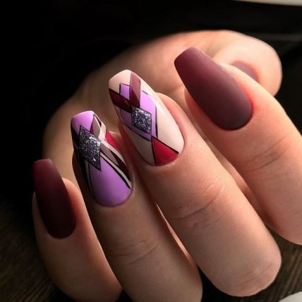 Геометрия на ногтях стала настоящим хитом. Почему бы не попробовать такой нейл-арт на своих ногтях в форме балерина? Лучше украсить один или два пальчика фигурными узорами а остальные оставить в однотонном выбранном лаке.