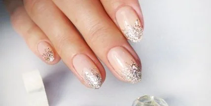 Блёстки глиттера могут иметь разный размер и окрас, что позволяет барышням оформлять множество идей и экспериментировать с сочетанием блестящих частиц и нюдовой основы. Глиттер красиво украшает как кончик ногтевой пластины, так и её основание.