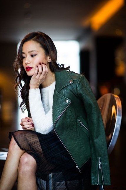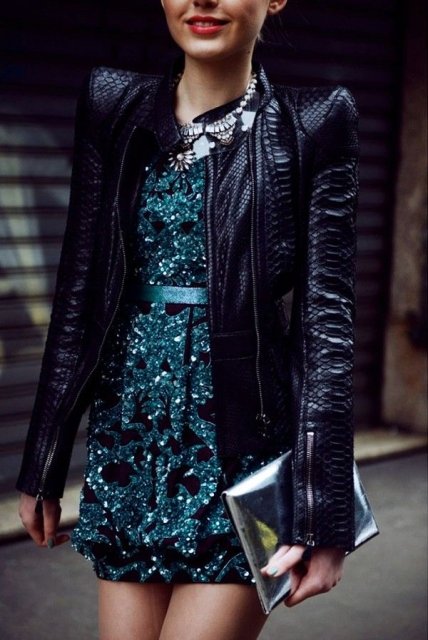 Кожаные курточки хорошо сочетаются с различными платьями, поэтому не нужно бояться добавлять их в женственные образы. Хорошо дополнит образ красная помада. Также можно добавить в наряд клатч и небольшие серьги.