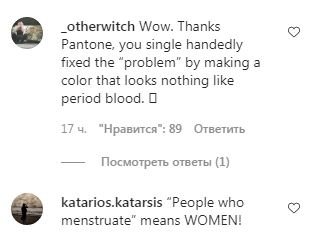 Однако, негативных отзывов все же больше. Многие женщины обратили внимание, что в сообщении от Pantone не упоминается слово "девушка" или "женщина". Они фигурируют понятием "люди, которые менструируют". Большинство представительниц прекрасного пола это очень обидело.