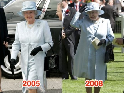 К примеру, в светло-голубом наряде монарха впервые видели во время визита на Мальту в 2005 году. Во второй раз она повторила образ во время для скачек в Аскоте в 2008. Больше в этом наряде на публике ее не видели.