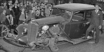 В 1930-х годах фотограф устремлялся к месту аварии и захватывал последствия автокатастроф, которые выглядели по-разному: ужасно, трагично, нелепо или смешно.