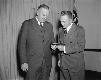 Адмирал Бэрд любуется медалью, присуждаемой помощнику в антарктической экспедиции