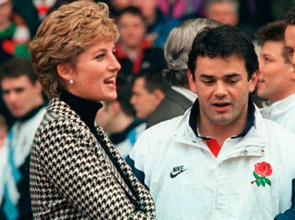 Диана приветствует членов английской сборной по регби. Рядом ─ капитан сборной Уилл Карлинг, 1994 год