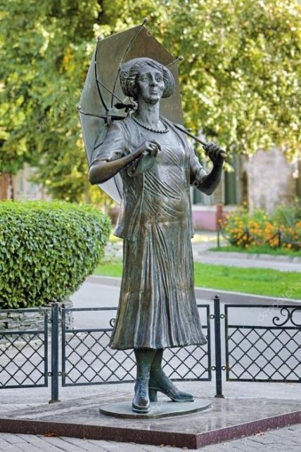 Первый памятник любимой миллионами зрителей актрисе был открыт на родине Фаины Раневской в Таганроге в 2008 году. На этой скульптуре актриса изображена в образе героини из фильма "Подкидыш": в смешной шляпке и с зонтиком в руках.
