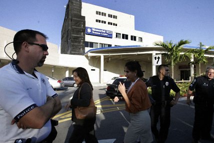 Полицейские у больницы, куда забрали Анну Николь Смит, 8 февраля 2007 года в Голливуде. Смит упала в обморок в комплексе Seminole Hard Rock Cafe Hotel and Casino. Она умерла до того, как ее успели доставить в больницу.