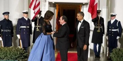 Президент Франции Франсуа Олланд на государственном ужине сидел между Бараком Обамой и Мишель Обамой.