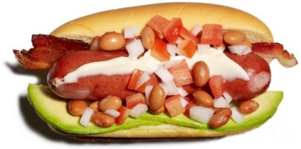 Берем разрезанную вдоль булочку для хот-догов, с одной стороны кладем обжаренный бекон, с другой укладываем дольки авокадо. Сверху укладываем сосиску. В завершении посыпаем фасолью, порезанными кубиками помидорами и луком.