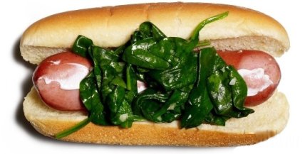В надрезанную вдоль булочку положить сосиску, смазать йогуртом, сбрызнуть лимонным соком, сверху выложить обжаренный чеснок, а затем шпинат.