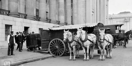 Тягачи, почтовые кареты, трамваи-конки, паромы на конной тяге – вот это все и составляло основу транспорта США в то время. Большинство фотографий в этой подборке сделаны в промежутке 1895 – 1905 гг. Фотографии демонстрируют нам широкий спектр применения лошадей. Это сегодня животные воспринимаются, как объект развлечения в виде конных прогулок. А до появления автомобиля, лошади были действительно основным транспортным средством. В крупных морских портах даже образовывались длинные пробки, прибывающих повозок с грузами. Животных было действительно жаль, потому, что, поступить как с автомобилем, в случае поломки, было невозможно.