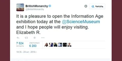 Выслушав его речь, королева на глазах у 600 гостей торжественной церемонии сняла перчатку и набрала свой первый твит на планшетном компьютере. В послании Елизаветы II, отправленном 724 тысячам подписчиков аккаунта @BritishMonarchy, говорится: ''С радостью сообщаю об открытии выставки "Эра информации" в Музее науки и надеюсь, что посетители будут довольны''.