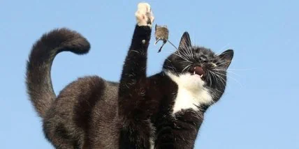Кот по кличке Могги привлек к себе внимание слишком динамичной возней на крыше сарая. Хозяин кота увидел, что тот поймал мышь и играет с ней.