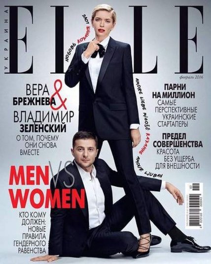 Действительно, на обложке Вера Брежнева в необычном образе, наверное, впервые фанаты увидели ее в мужском костюме и с прической, подобной больше мужчине, нежели женщине. Выдает Веру только утонченная обувь на шпильке и красная помада. Владимир Зеленский на обложке расположился у ног Брежневой, что и стало причиной для скандала в ленте комментариев под фото.