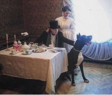 В этот раз 85-летний актер и его молодая супруга поделились результатом своей фотосессии в ретро-стиле. На некоторых снимках пара предстала в образе дворян, устроивших в своем особняке чаепитие. У стола, за которым расположились супруги, восседает огромный черный дог.