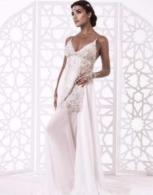 На фото Санта позирует в летнем свадебном платье на тонких бретелях и с глубокой линией декольте. Свадебный наряд состоит из двух частей: в верхней его части он расшит кружевом и кристаллами, а низ выполнен из нежного шифона. Аксессуарами дополнена прическа певицы, а на ее руке сверкает оригинальный браслет.