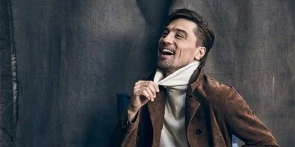 Певец изображен на фото по колено в воде. При этом он одет в длинные светло-бежевые брюки и небесно-голубой пиджак на голое тело.
