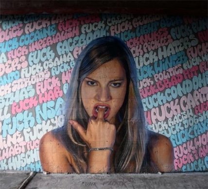 Теру поделился фотографией граффити художника Ника Флэтта, красующейся на одной из стен в Берлине. На картине изображена девушка с засунутым в рот средним пальцем, а вокруг нее расположены надписи "Fuck империализм", "Fuck война", "Fuck политика", "Fuck расизм", "Fuck налоги", "Fuck Фейсбук", "Fuck ненавистники", "Fuck кокаин" и много других.