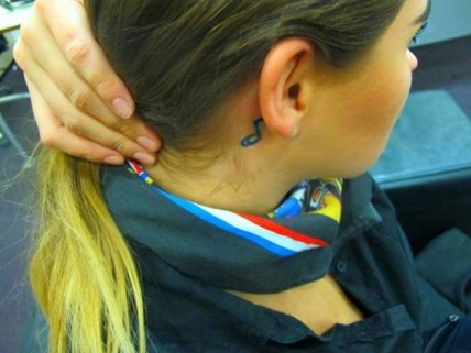 На снимке певица изображена спиной к камере, демонстрируя свое тату. Наколка сделана за правым ухом звезды, в виде музыкальной ноты.