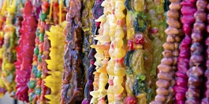 Чурчхела - грузинское лакомство из виноградного сока и нанизанных на нитку орехов - обычно имеет размер около 30 см. Рецепты приготовления чурчхелы в разных районах Грузии несколько отличаются. Чурчхела также пользуется популярностью на Черноморских курортах, а в Армении и Азербайджане встречается под другими названиями.