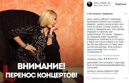 "К сожалению, вынуждена отменить все концерты февраля, немного не рассчитала свои силы на горных склонах, катаясь на лыжах и повредила ногу. Уже сделана операция и я прохожу курс реабилитации. Это жизнь. Надеюсь на понимание моего слушателя. Концерты не отменяются, а состоятся в марте как только я вернусь из США, где обо мне заботятся и ставят меня на ноги мои врачи. Всех люблю и жду встречи", - подчеркнула певица.