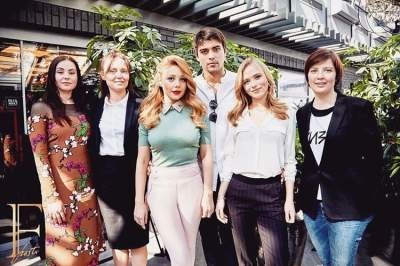 Для выхода в свет Тина выбрала бледно-розовые брюки и зеленую кофту с воротником. Свой образ артистка дополнила лодочками в тон, объемными локонами и красной помадой. Кошмал предпочла брючный костюм в полоску и белую блузку, а Ходос – платье с ярким рисунком.