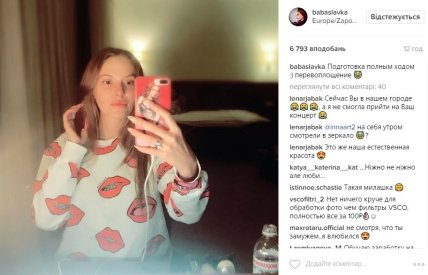 На нем она одета по-простому, в обычном свитшоте и без тонны косметики. Изюминка этого фото, что на одежде изображены губы, которые похожи на ее собственные, хоть она их особо и не выделяла. Можно заметить, что у Славы очень красивые пышные губки, которые соблазнительны даже без помады и блесков. Большинство поклонников решили, что певице можно без стеснений публиковать простые снимки без косметики, она все равно выглядит сногсшибательно и очень мило.