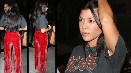 Кортни Кардашян выделилась своим очередным откровенным нарядом. Звезда реалити-шоу выбрала для похода в церковь, что в Беверли-Хиллз, мужскую футболку с логотипом и изображением группы ACDC, которую она подвязала под грудью, а также красные велюровые штаны.