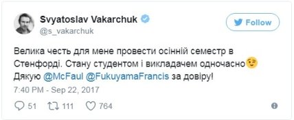 "Стэнфордский центр демократии, развития и верховенства права (CDDRL) рад приветствовать Святослава Вакарчука в качестве приглашенного преподавателя на осенний семестр", – сообщается на официальном сайте заведения.