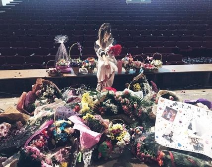 «Я смотрю на это фото и мне не верится, что это я, среди всех этих цветов, после большого сольного концерта «Время и Стекло». Мои любимые моменты выступлений — это выход (волнение перед выходом) и момент после концерта, когда я вижу пустой зал… Он такой тихий, но заряженный безумной энергетикой. Обычно, после концерта, я сажусь на сцену, смотрю в зал, рассматриваю ваши подарки и цветы. Мне становится очень тепло», — написала в личном микроблоге Надя Дорофеева, и поблагодарила всех, кто пришел на концерт группы: