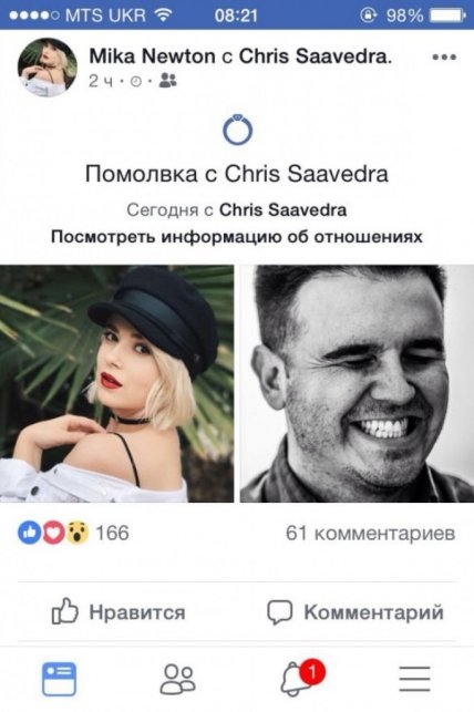 Украинская певица, участница Евровидения-2011 Мика Ньютон собирается замуж за американского бизнесмена. Об этом звезда сообщила на странице в Facebook, где сменила статус на "помолвлена". Избранником Ньютон стал некий Крис Сааведра. Судя по информации на его странице в соцсети, он занимает должность CEO в Saint Agency – компании, которая представляет Мику в Штатах.