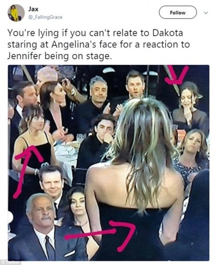 Энистон даже не вышла на красную дорожку, однако в зале двум звездам не удалось избежать встречи. Зрители сделали стоп-кадр, когда Дженнифер вышла на сцену вместе с актрисой Кэрол Бернетт представить награду, а в то время Джоли опустила глаза и пыталась смотреть в сторону. А наблюдала за этим неудобным моментом Дакота Джонсон.
