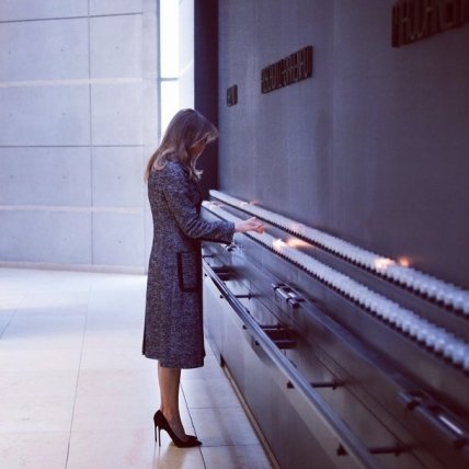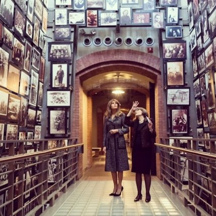 Мелания осмотрела музей, а также почтила память погибших у молитвенной стены минутой молчания. Для выхода в свет первая леди США выбрала серое пальто с карманами от Dolce & Gabbana и черные туфли.