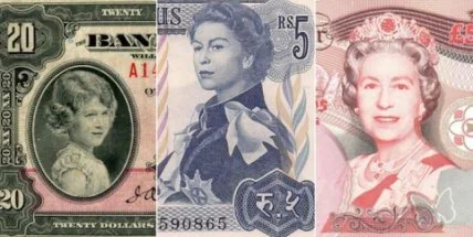 Будучи королевой ряда стран Содружества, республик, краев и областей, обладает интересным набором привилегий, одна из которых изображение профиля на платежных средствах. Ниже представленны банкноты из 15 стран мира с изображением королевы Елизаветы в возрасте от 8 до 85 лет.