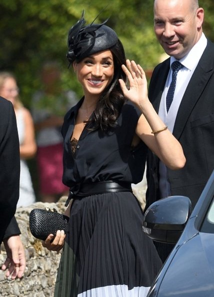 Мы уже рассматривали стильный образ Меган Маркл, однако вынуждены снова вернуться к этой теме. Все дело в том, что верхняя пуговица на платье-плиссе Club Monaco, в котором герцогиня пришла на свадьбу, расстегнулась. Знакомясь с гостями, Мег настолько увлеклась, что не сразу обратила внимание на это.