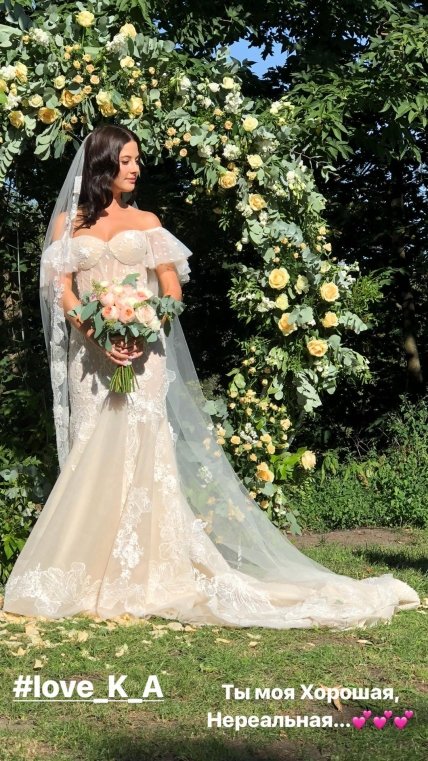 Для свадьбы Настя выбрала классическое белое кружевное платье с фатой, которое подчеркнуло точеную фигуру певицы. Длинный шлейф и оголенные плечи придали образу женственности и нежности. Жених, в свою очередь, выбрал для торжества синий пиджак и белые брюки.