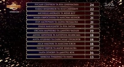 По итогам первого выпуска наибольшею сумму баллов набрала пара Руслана Сенечкина и Яны Цибульской. На втором месте оказались Павел Вишняков и Юлия Сахневич, а на третьем - Женя Кот и Мишель Андраре. На последнем месте разместилась пара Николая Тищенкол и Nana. Напомним, что в первом выпуске шоу не покидает ни одна из пар.
