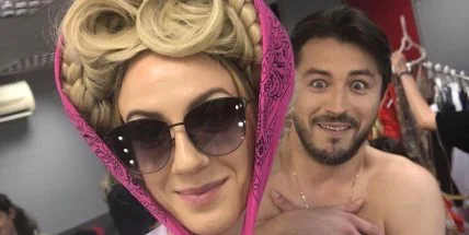 На своей странице в Instagram знаменитость опубликовала снимок, на котором запечатлена в сиреневом пиджаке, солнцезащитных очках и розовой бандане, повязанной на причудливой прическе. Позади Никитюк с испуганным выражением лица и по-женски прикрытым руками голым торсом красовался Сергей Притула.