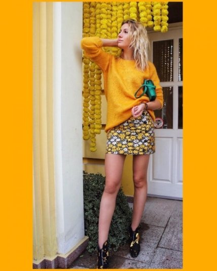 На снимке звезда позирует в стильном осеннем аутфите – желтом свитере и короткой юбке с цветочным принтом. Также Леся подобрала обувь, гармонирующую с нарядом – полусапожки с узорами желтого цветам.