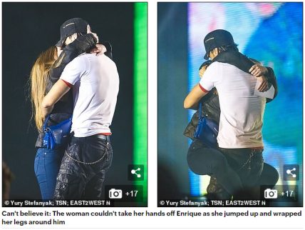 "Успокойся, Энрике! Иглесиас страстно целует фанатку во время концерта в Украине в то время, как она в восторге обнимает его ногами... И это спустя всего месяцы после рождения Анной Курниковой близнецов", – пишет издание. Но как выяснилось, Энрике часто целуется со своими поклонницами во время концертов.