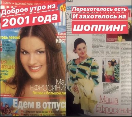 В своих Instagram-сторис Маша Ефросинина опубликовала два архивных фото, на которых она позирует на обложке журнала и забавно подписала их. Судя по подписи Маши, снимки были сделаны в 2001 году. В то время она весила на 20 килограммов больше.