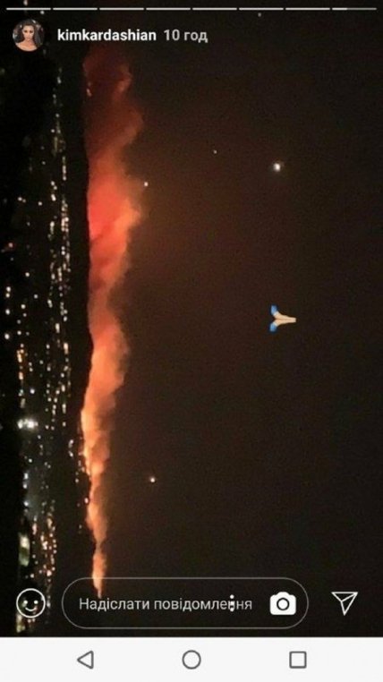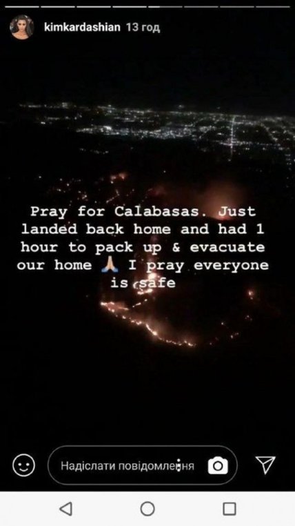 Она поделилась снятым в сториз в инстаграм, и рассказала подписчикам, что ей пришлось эвакуироваться и попросила «молиться за Калабасас».