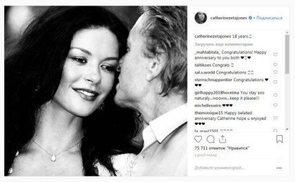 Черно-белый кадр актриса опубликовала на своей странице в Instagram в честь годовщины свадьбы с Дугласом. Накануне звездная пара отметила 18-летие совместной жизни – бирюзовую свадьбу, которую также называют совершеннолетием семьи.