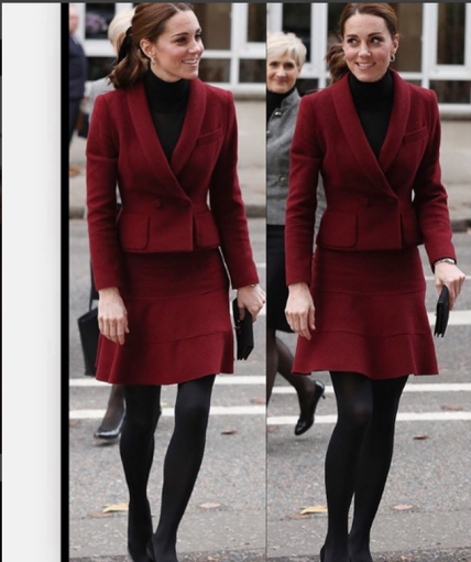 На познавательном мероприятии Кейт Миддлтон появилась в черной водолазке и бордовом костюме с короткой юбкой от Paule Ka. К эффектному наряду герцогиня подобрала плотные черные колготы и клатч. Обувь на удобном каблуке завершила look жены принца Уильяма.