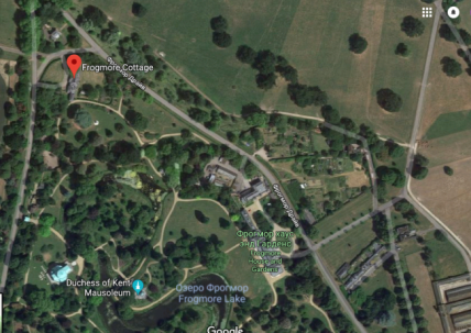 Коттедж Фрогмор находится на территории загородной резиденции Фрогмор Хауз (Frogmore House), здание которого было построено в начале 17 века. Находится в 1 км от Виндзорского замка. Резиденция известна главным образом своим парком, в котором, помимо садовых павильонов и пышного неоренессансного мавзолея герцогини Кентской (матери королевы Виктории), расположена усыпальница самой Виктории и ее супруга Альберта. Место, как видно, имеет важное историческое значение.