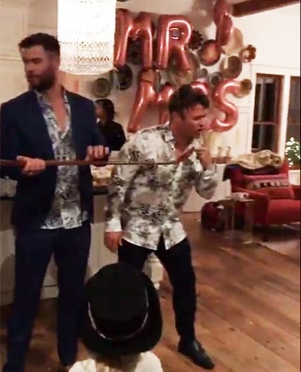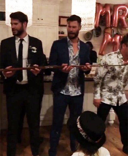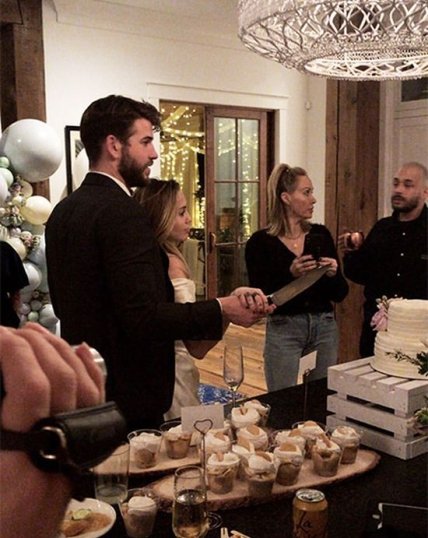 На одном из кадров Майли и Лиам готовятся разрезать явно свадебный торт, причем певица, похоже, в свадебном, белом платье, актер – в строгом черном костюме с белой рубашкой. На другом кадре засветились братья Лиама, Крис и Люк, а также в кадр попала надпись "Мистер и миссис" из воздушных шариков, украшающая стену.