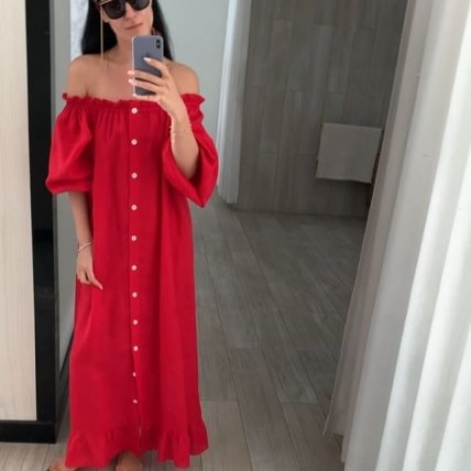 Маша Ефросинина в красном сарафане с открытыми плечами