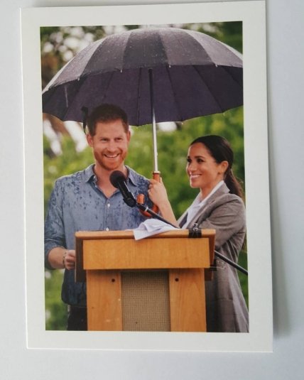 Пара выбрала второй вариант фото из кадров, сделанных во время их первого международного тура. Принц Гарри и Меган Маркл остановились на снимке, где беременная герцогиня держит над своим мужем зонт. В это время внук Елизаветы II произносил речь перед фермерами одного из городов Новой Зеландии. Снимок стремительно облетел все западные СМИ и стал очень популярным. Именно поэтому пара выбрала его, как второе фото для рождественской открытки.