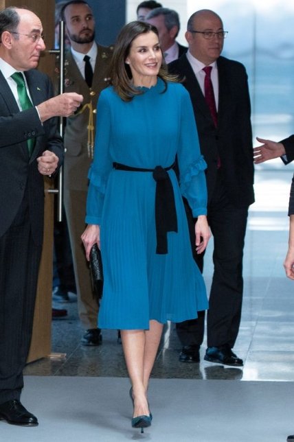 На мероприятие Летиция надела яркое голубое гофрированное платье с длинным рукавом от бюджетного бренда Zara. На талии его подчеркивал тонкий черный поясок.