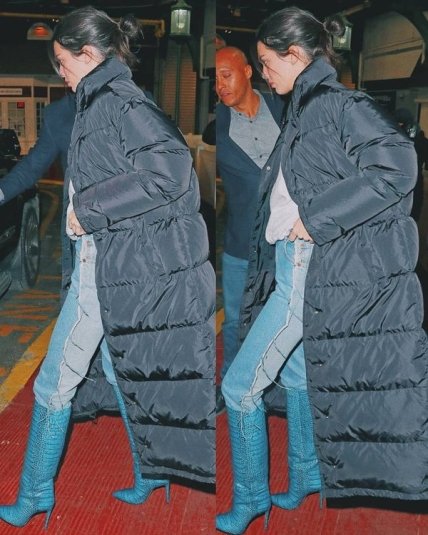 Сверху она надела черный пуховик, длиной по колено. Однако изюминкой ее образа стали синие сапоги из змеиной кожи на высоких каблуках. Кендалл заправила джинсы в халяву, тем самым подчеркнув свой выбор.